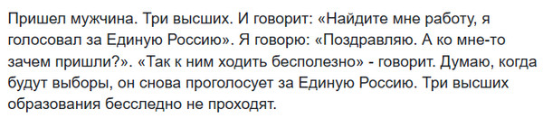 Тут дело даже не в связке "голосовал за когонадо, работу они ему не дадут, но проголосует все равно за них". Об уровне говорит еще и полное непонимание того, что работу ищут малость не так и вопрос-то был не по адресу. А что до тех, за кого голосовал - строго говоря, они и не должны предоставлять ему работу. Во всяком случае - не напрямую. Сильно не напрямую.