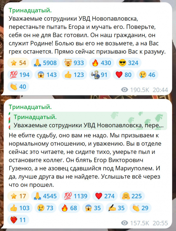 Потом в его ТГ пошли слухи, что Гузенко менты пытают. Да-да, настоящего патриота - ну как это? Ладно бы еще пытали всяких черножопых, азовцев и эту либеральную сволочь, но Егора-то за что?