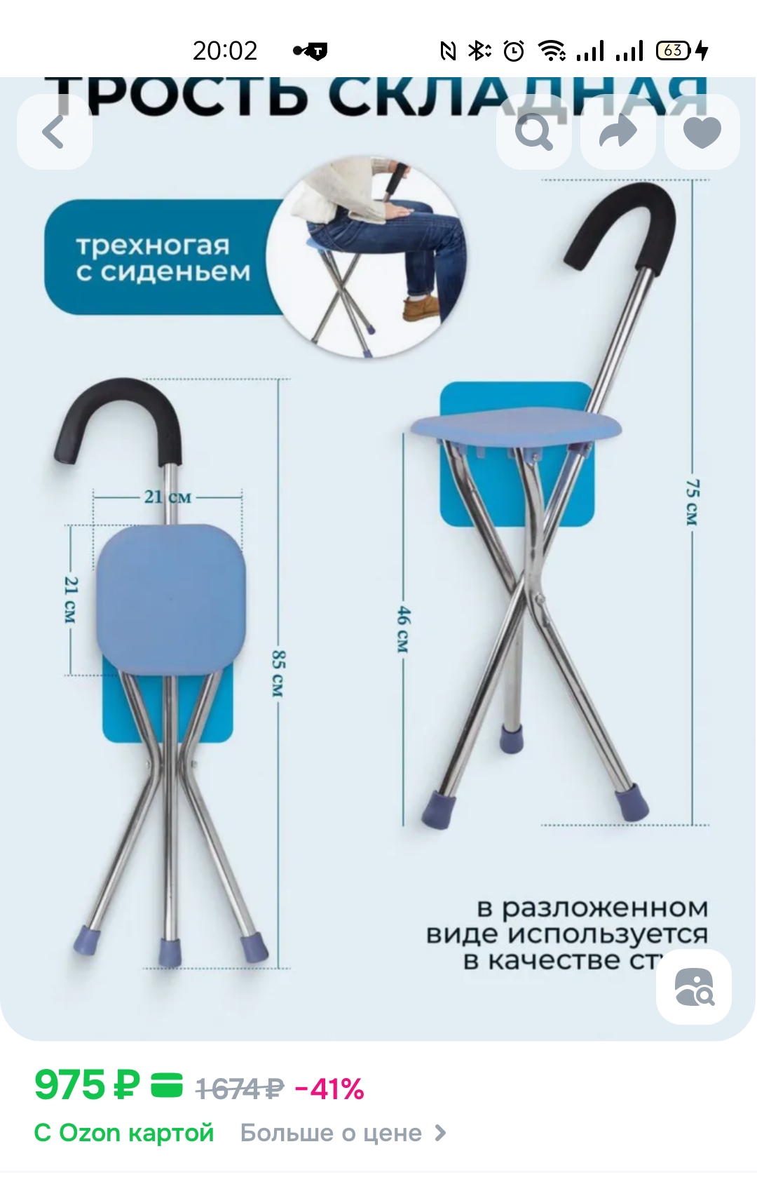 Нам родственники такую трость отдавали, когда папе протез сделали, но он с ней не стал ходить, сказал, что неудобная трость, классическая ему привычней. Я как-то попробовала присесть на эту трость-стул, но показалась хлипковатой и не очень устойчивой