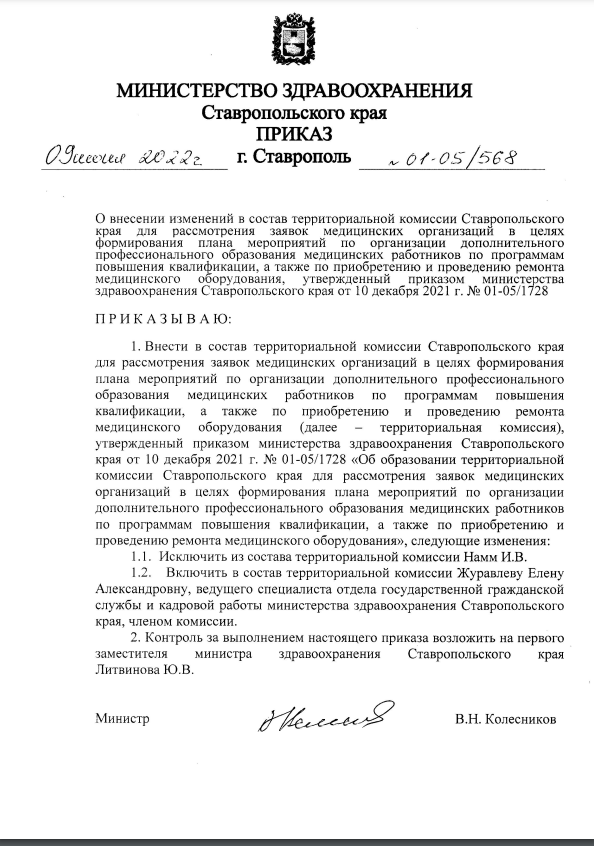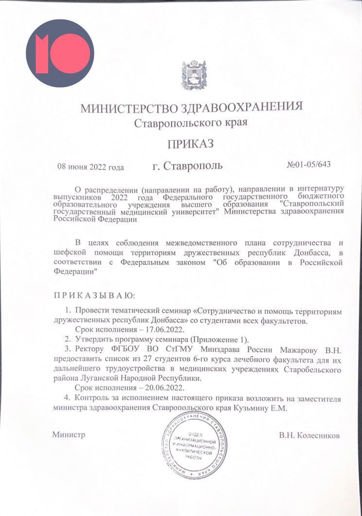 Сканы с приказом министра здравоохранения Ставрополья Владимира Колесникова прислали «МО» студентка медвуза и местная жительница. По словам последней, подлинность документа подтвердили ее знакомые медики.