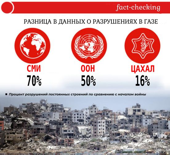 Из официальных данных ЦАХАЛа, впервые обнародованных 27 июня изданием Ynet, следует, что с 7 октября 2023 года до 21 мая 2024 года было разрушено лишь 16% стационарных зданий в секторе Газа. При этом ООН в своих отчетах показывает свыше 50%.