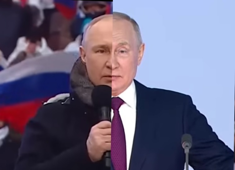 Можно долго сравнивать фото Путина от 21 и от 22 февраля, как это сделали вот здесь. И там видны явные отличия - волосы на голове, морщины, щеки (прям заметно отличаются).