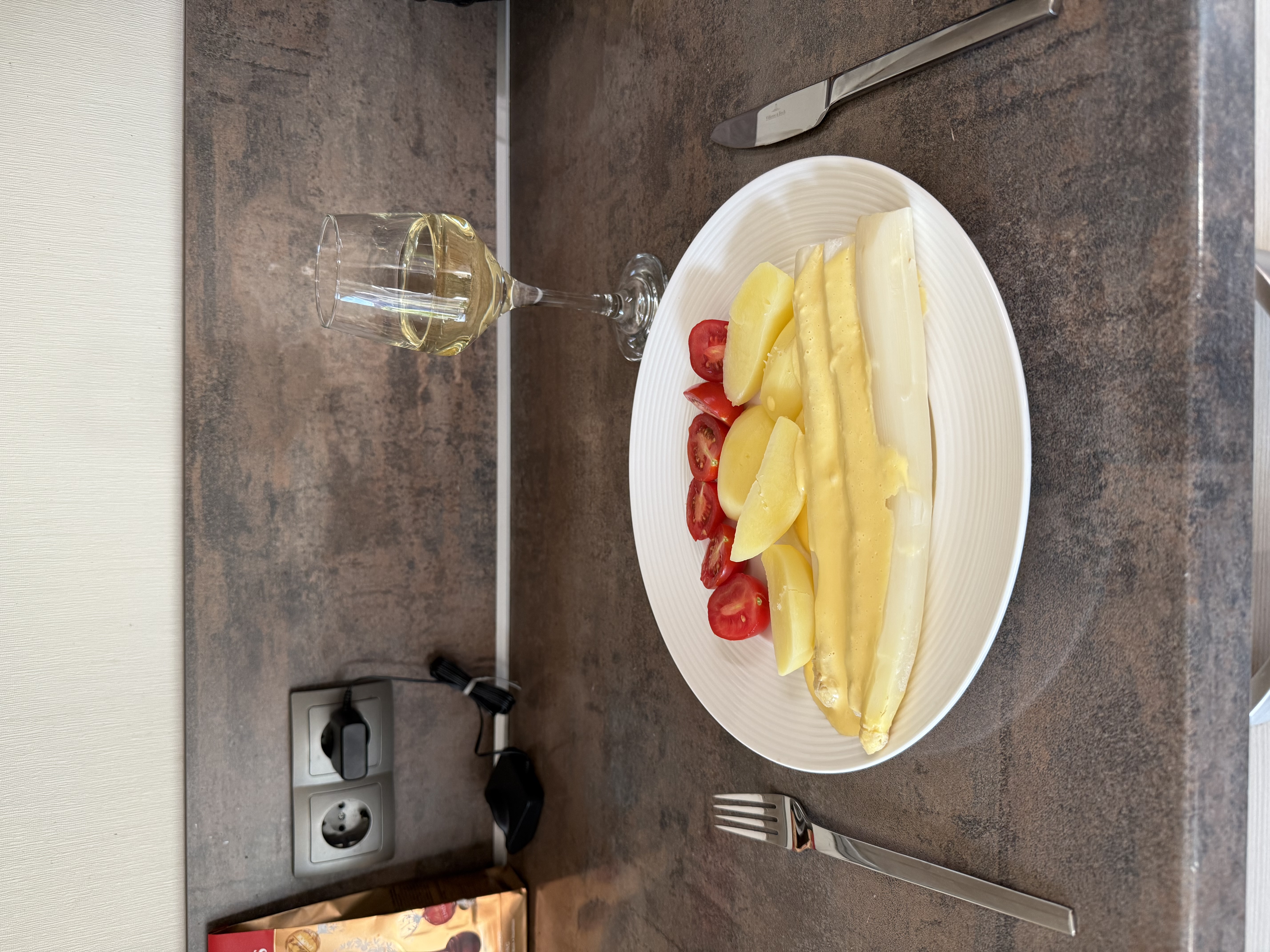 Затем спаржа поливается подогретым соусом Холландез и опционально подается тонко нарезанный хамон или прошутто, либо лососина. Но если спаржа хорошая - то ее можно и так, без опций, просто с холодным Граубургундером (ваш Албариньо, тоже прекрасно впишется).