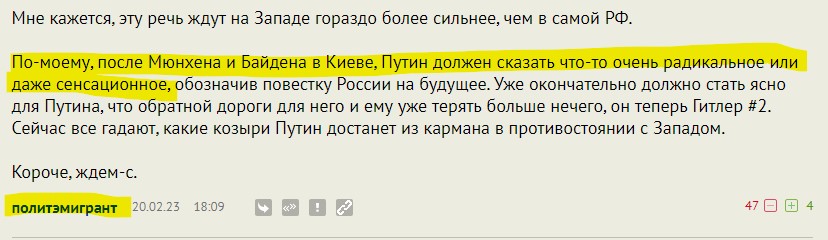 А его пассаж про несчастных соотечественников заграницей?! Я аж чуть не прослезилась от переживаний за бедных русских, которых на Западе оказывается считают людьми второго сорта, презирают и всячески издеваются. И только на родине, в родных российских ебенях у россиян есть будущее, а заграницей его у них нет, там они никому не нужны и ходят с протянутой рукой. Полагаю, все депутаты, сенаторы, министры, пропагандоны и пр. тоже прослезились и кинулись звонить своим детишкам, чтоб спасти их от ужасных унижений и вернуть в родные пенаты.
