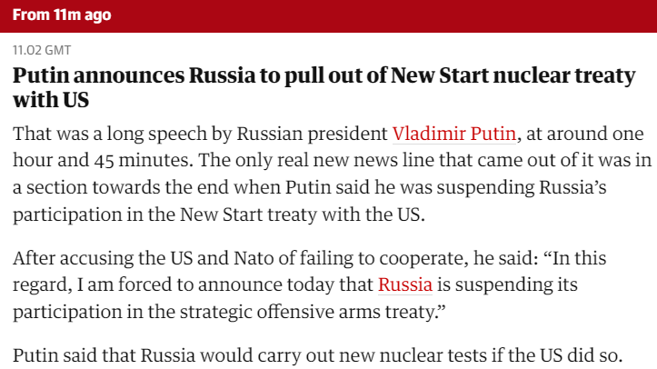 Заявил о приостановлении участия в договоре о стратегических наступательных вооружениях.
