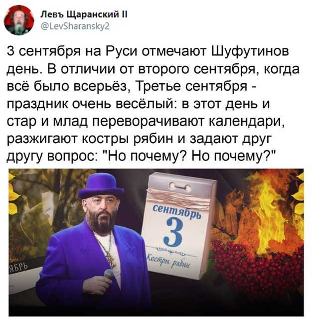 3 сентября на Руси Шуфутинов день! В отличии от 2 сентября, когда всё было всерьёз, Шуфутинов день - праздник очень веселый: в этот день и стар и млад переворачивает календари, разжигают костры рябин и задают друг другу вопросы "Ну почему, ну почему?"