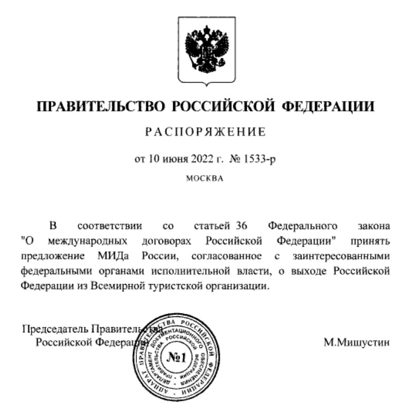 По предложению МИДа правительство РФ в лице председателя выпустило распоряжение о выходе РФ из Всемирной туристской организации.