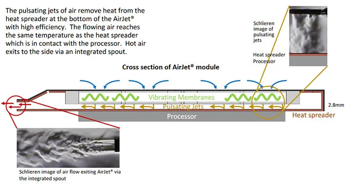 Внутри тонкой черной прямоугольной платы AirJet находится множество крошечных мембран, которые вибрируют на ультразвуковых частотах, создавая «высокоскоростные пульсирующие охлаждающие струи» воздуха.