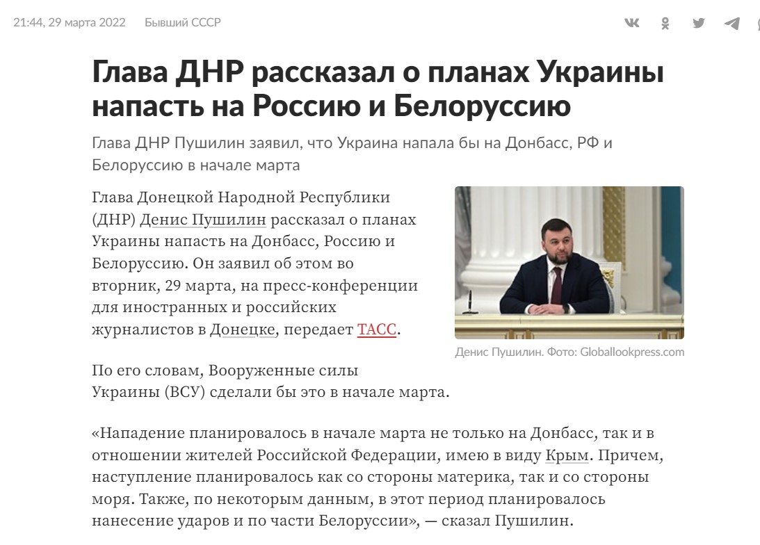 Нормальненько, да? Войну в Украине развязал Киев (сами на себя напали, ясный пень), Киев подло бомбит украинские города, а российские миротворцы бегают по Украине и умоляют жидобондеровцев остановиться. Поразительные ублюдки, просто поразительные. Однако, что интересно, недорогим россиянам всякие соловьевы-киселевы настолько просрали мозги, что они даже этой бредятине верят.