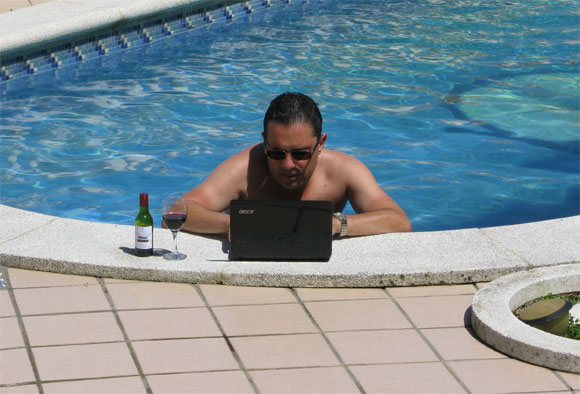 Неужели на экране нетбука что-то видно при таком освещении? Судя по тени, испанское солнце почти прямо над головой.