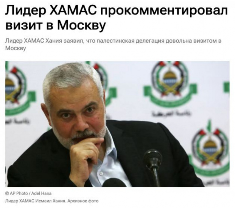 "Делегация ХАМАС встретилась с главой МИД РФ Сергеем Лавровым, также прошли наши встречи в Госдуме и других структурах. Мы обсудили вопросы безопасности и дальнейшего сотрудничества, в том числе на Ближнем Востоке", - сказал Хания во время посещения Соборной мечети Москвы.
