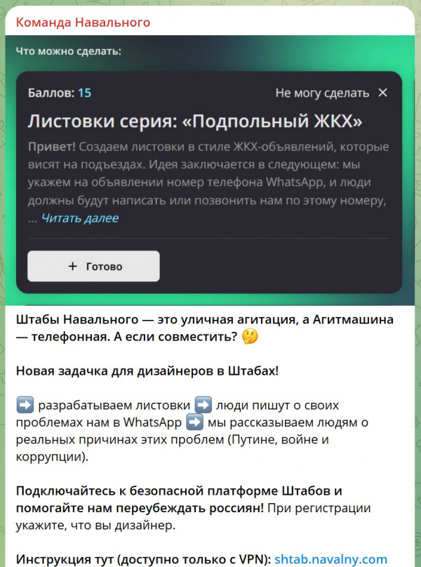 Идея же гениальная! Разрабатывают листовки в стиле ЖКХ, люди по указанному WhatsApp пишут им о том, что прорвало трубу, тараканы съели кота, вместо горячей воды течет ржавчина, ну и крыша протекает который год, а они им радостно отвечают: "А вы знаете, что это все из-за Путина, войны и коррупции?"