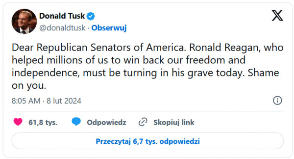 После этого премьер-министр Польши Дональд Туск обратился к Сенату США со словами: «Рональд Рейган, который помог миллионам из нас вернуть свободу и независимость, сегодня, должно быть, в гробу переворачивается. Позор вам».