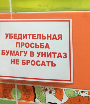 Где-то в иностранном туалете видел надпись исключительно на русском языке: "Дорогие гости, просим вас бумагу бросать ТОЛЬКО в унитаз. Бросать её в ведро НЕГИГИЕНИЧНО!"