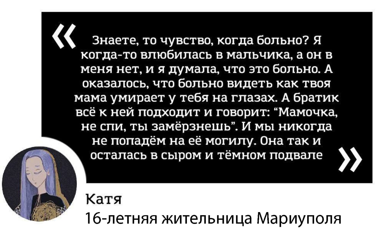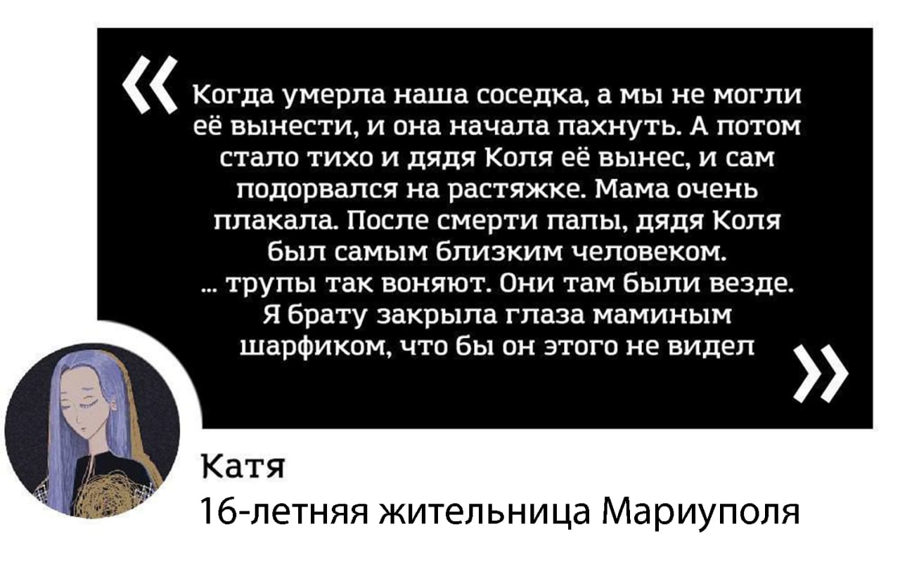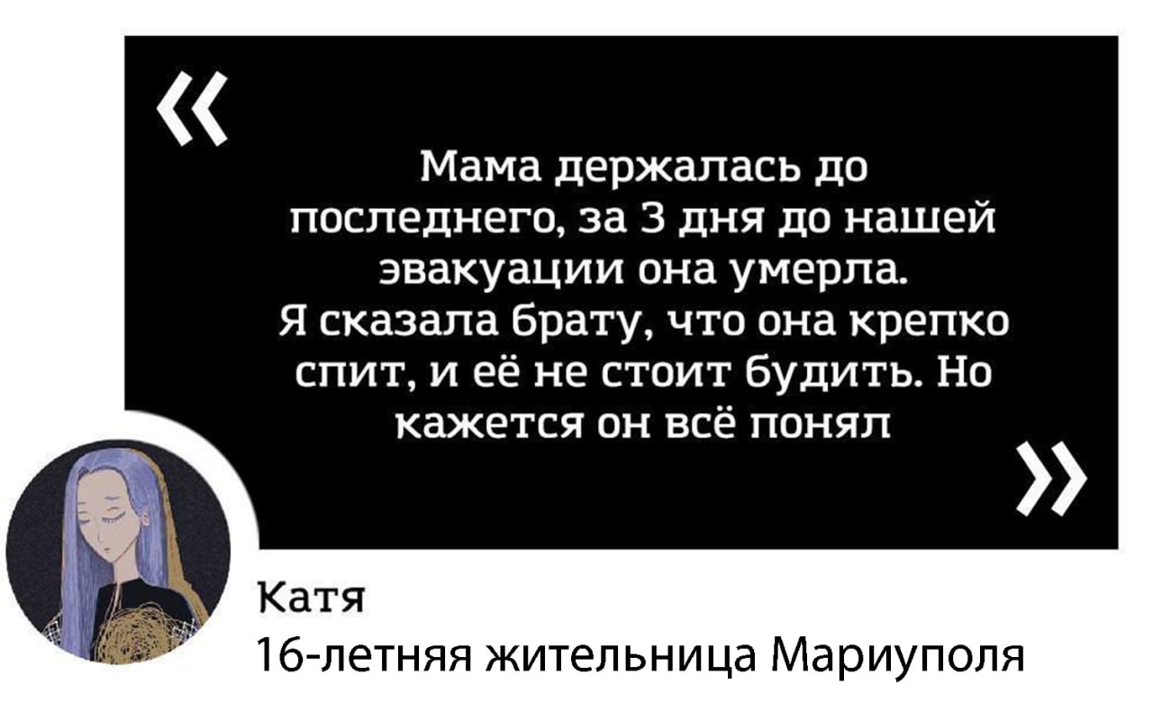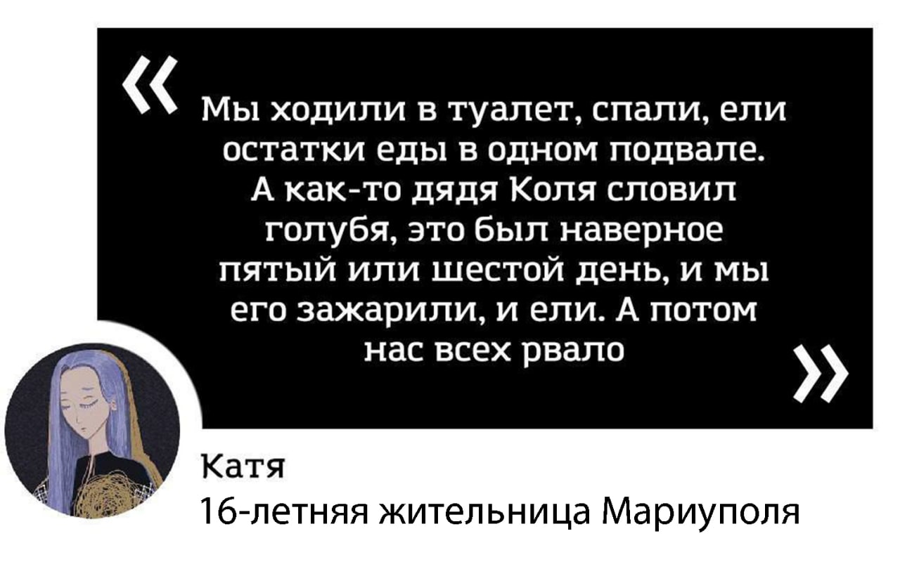 "Они пробрались к нам в бункер, первые дни относились хорошо, помогали с едой. Но мозги у них промыты пропагандой, да и нормальные люди не пришли бы на чужую землю. В тот момент в городе шли интенсивные бои, нас не выпускали. Мы сидели в абсолютной темноте. Никакого света, воды и тепла, конечно, не было. Потом этих военных сменили другие, 7 марта они вывели сначала женщин с детьми, а потом мужчин.