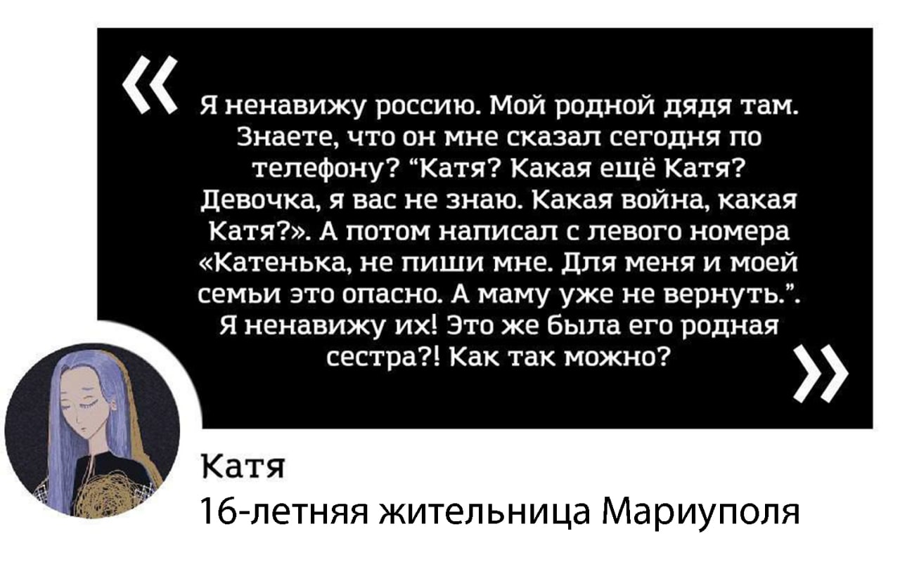 Я хочу написать ему что-нибудь человеческое, выразить мою скорбь к украинцам, ненависть к РФ. Но как?! Что я - гражданин РФ, могу сказать человеку из Мариуполя? Я не знаю, что сказать, таких слов не существует.
