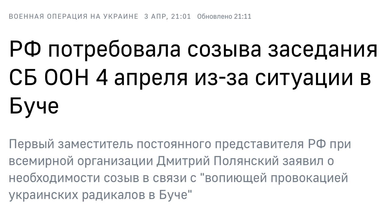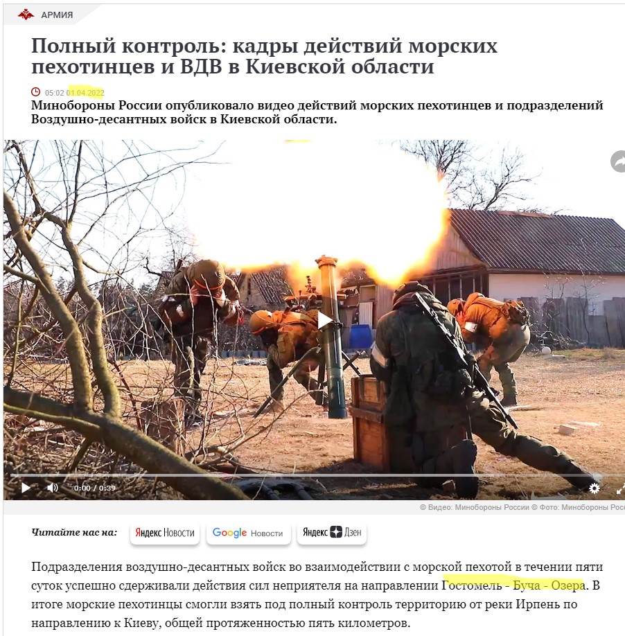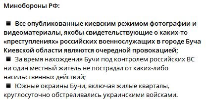 По имеющимся сведениям, в целях дискредитации российских военнослужащих Министерство обороны Украины распространило по западным СМИ видеозаписи, снятые в городе Буче Киевской области, как доказательство массового уничтожения мирных жителей. Согласно данным Министерства обороны Российской Федерации все опубликованные киевским режимом материалы о преступлениях российских военнослужащих в указанном населенном пункте не соответствуют действительности и имеют провокационный характер.