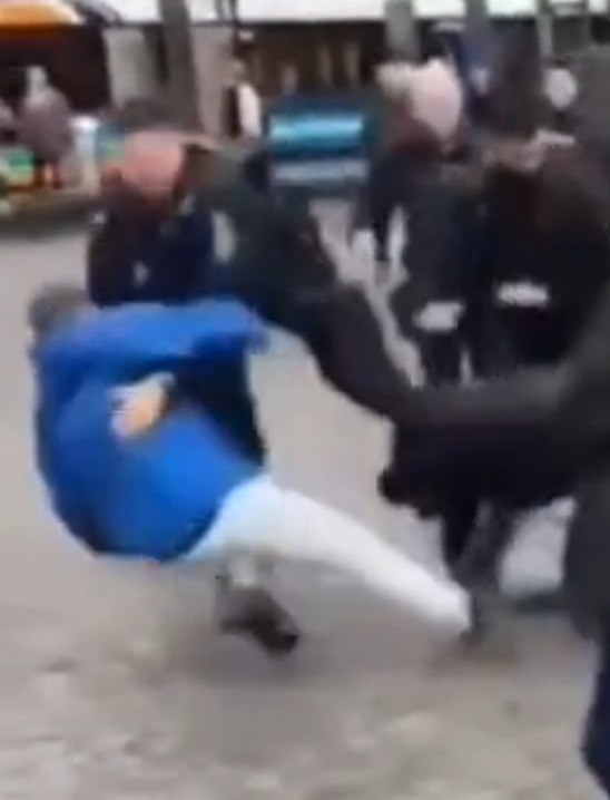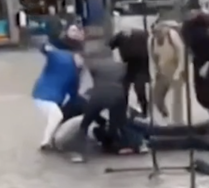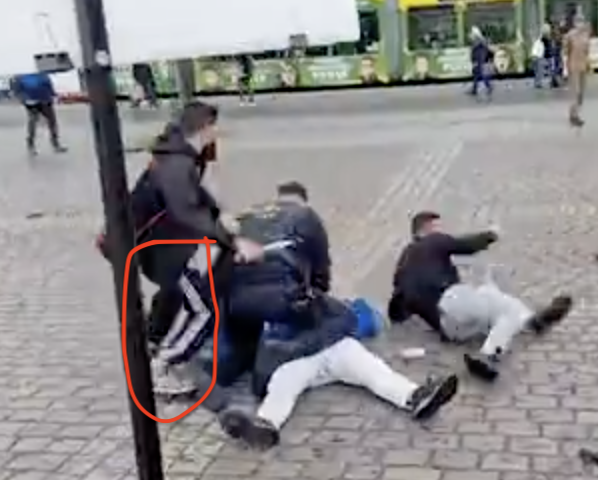 На втором видео прямо четко видно, что синяя куртка бьет (почем зря!) чувака в белых штанах, который и оттаскивает мигранта от другой синей куртки!