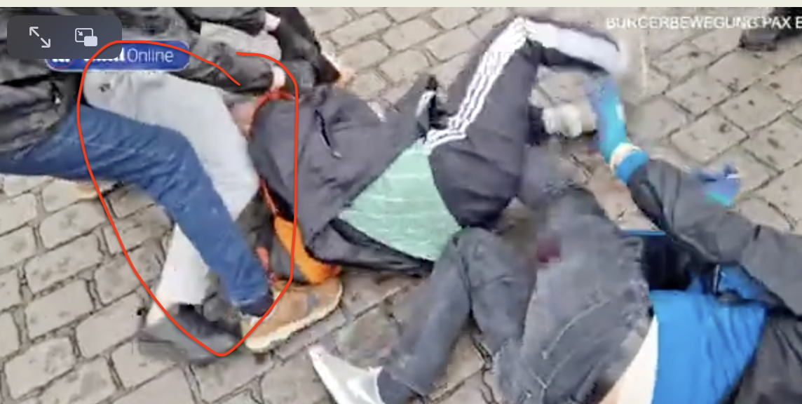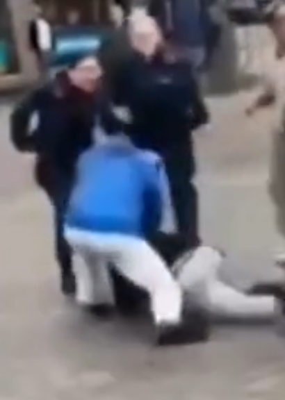 И полицейский его оттаскивает не от мигранта с ножом, а от других белых штанов!