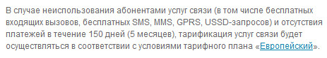 Если абоненты МТС в Московском регионе не пользуются услугами связи, как платными, так и бесплатными (например, прием входящих звонков, USSD-запросы), в течение 150 дней, то тарификация услуг будет осуществляться в соответствии с условиями тарифного плана "Европейский" (абонентская плата на тарифе "Европейский" составляет порядка 333 рубля в день).
