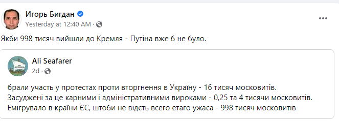 Насколько я помню, майдан вообще был направлен не против президента, а против отмены обещаний интеграционной политики с Западом. Более того, майдан не свергал президента, Янукович постыдно бежал. И в украинской истории это было единожды, а не "раз-два". Но беда в том, что экспансия России на Украину произошла бы независимо от майдана 2014 года. Это была реставрация коммунистической империи, которая не могла существовать в строго заданных границах. Более того, Путин сам по себе - полный ноль, попробуйте найти его персональные достижения (я не про десять шайб в одном матче и не про щуку в 21 килограмм). В РФ, да и в Украине-2013, не была проведена декоммунизация ни по персоналиям, ни по идеологии. Сейчас, правда, в Украине проводится уже деруссификация, как более масштабный вариант запоздалой декоммунизации. Винить одного Путина - это, пусть не сродни винить флюгер в урагане, означает непонимание всей проблемы. Путин - мудак и дурак, это понятно, но он не держит в руках оружие, в отличие от двухсот тысяч российских солдат на Украине, он не тусуется на Z-митингах с сотнями тысяч россиян, он не ведёт своих внуков в школу на уроки патриотизма - как поведут миллионы. И более того, он не живёт бок о бок с учителями, которые ведут эти уроки и раз в несколько лет помогают искажать результаты выборов. А ведь эти учителя - добрые соседи и обычные приятели многих, кто здесь пишет.