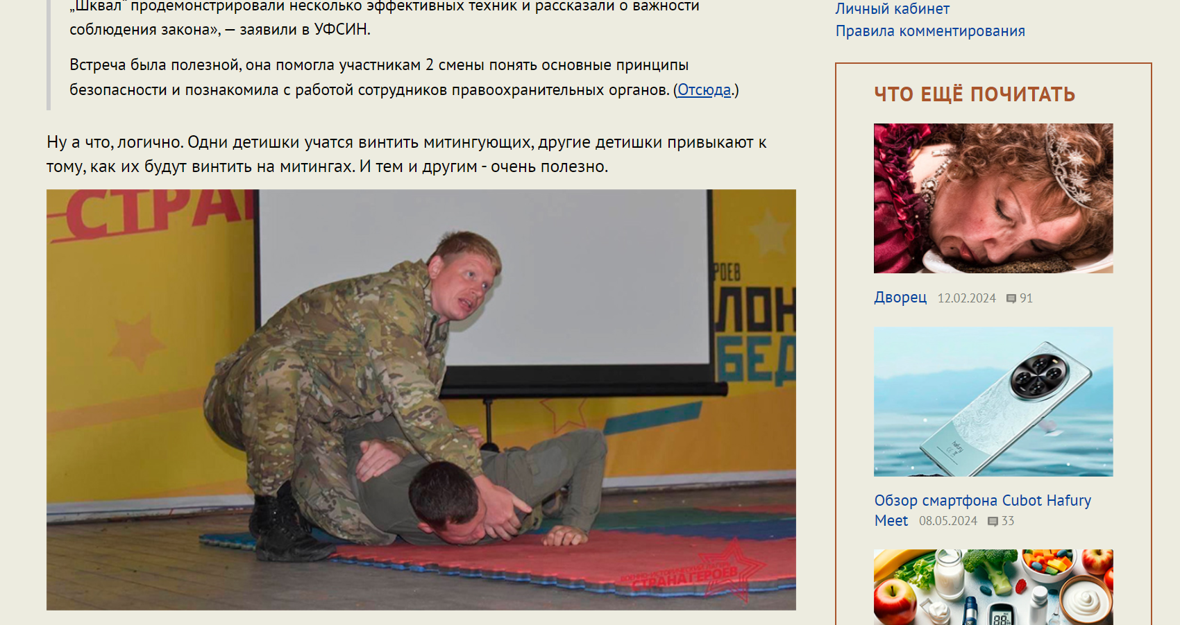 Также приемы разгона митингов показывали на церемонии посвящения в кадеты в Златоусте. Спецназовцы ФСИН наступали на воображаемую толпу с криками «Палкой бей» и синхронно выполняли соответствующие удары. Похожее мероприятие прошло в военной комендатуре Екатеринбурга для членов «Юнармии».