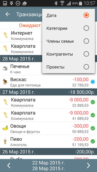 Здесь можно просматривать все транзакции и делать на них соответствующие отметки. Транзакции можно сортировать по датам, категориям, членам семьи, контрагентам и проектам.