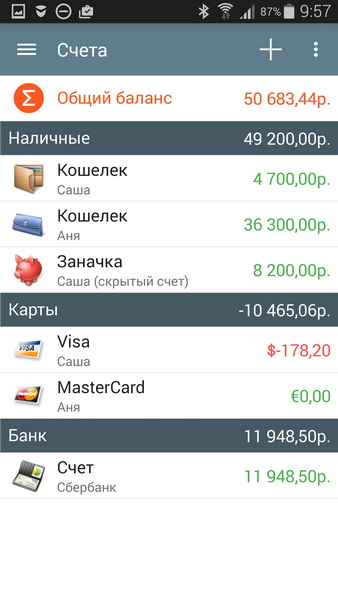Счета делятся на три основные категории: наличные, карты и банк. Также вы можете добавлять какие-то иные виды счетов.