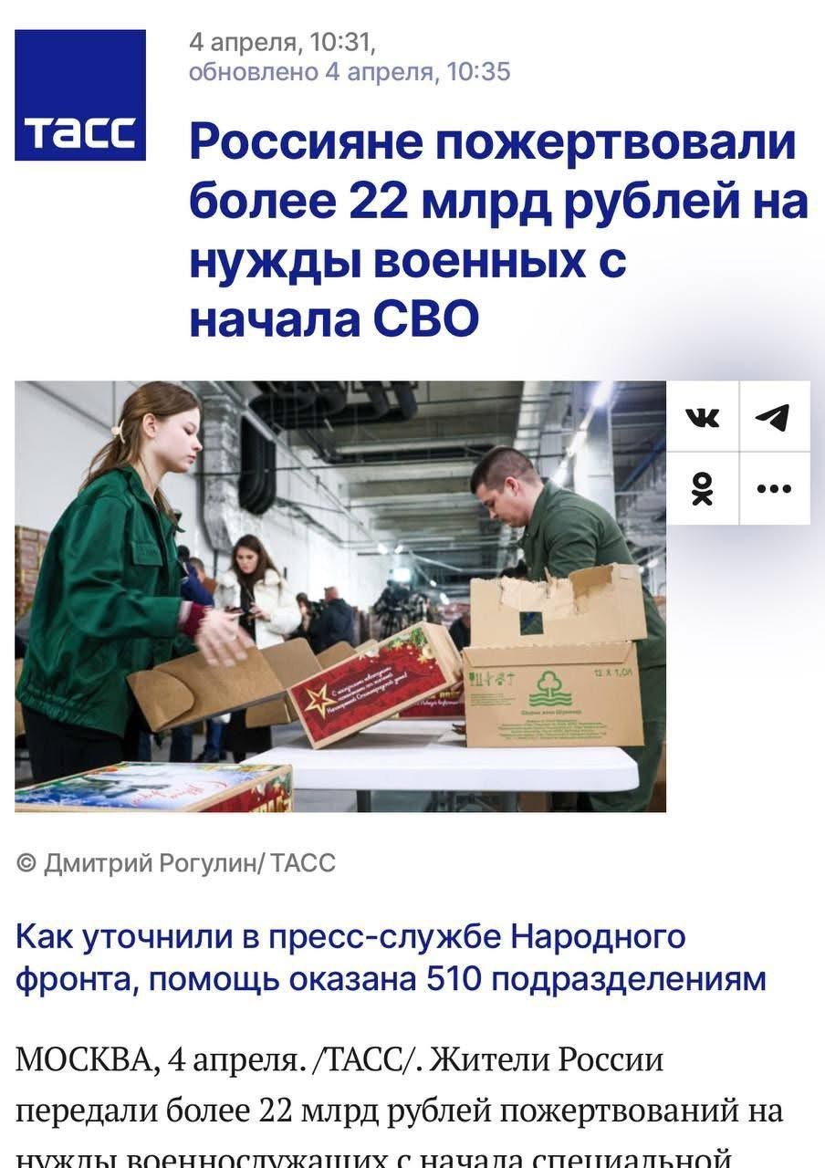 Кстати да, подобная статистика как раз говорит, что никакой массовой (не на словах) поддержки войны снизу нет. Сумма какая-то позорная озвучена. На месте ТАСС я бы лучше промолчал, чем такое оглашать.
