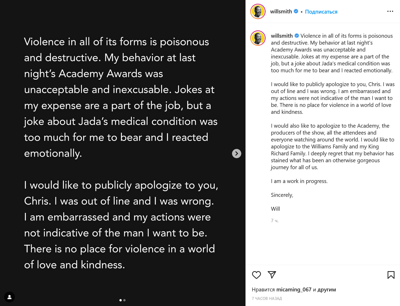 «Насилие во всех его формах токсично и разрушительно. Мое поведение на вчерашней церемонии  премии "Оскар" неприемлемо и непростительно. Шутки про меня – часть работы, но шутка о состоянии здоровья Джады была для меня невыносимой, поэтому я отреагировал эмоционально.