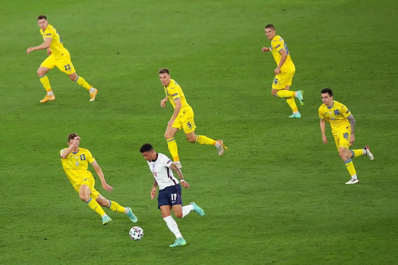 Украина играла вторым номером, часть игроков, критично важных для разгона атаки, были в лазарете или функционально не готовы после травм (Зубков, Малиновский, Цыганков), часть не восстановилась после Швеции и критично отставала в скоростях перед обороной Англии (Ярмоленко, Яремчук). Кроме того, явно хромал низ из молодых пацанов из украинского чемпионата (Миколенко, Матвиенко), поэтому при любой блокировке атаки центр и атака откатывались назад (храбрый и бессмысленный херак по воротам без явной цели привел бы к контре и проблемам). Лучше отойти, растянуть линии Англии и попытаться подойти снова. Опять же, пока мяч у тебя, тебе не забивают. Весь первый тайм это удавалось и было несколько острых ударов, которые поймал Пикфорд (в статье почему-то не упоминается об этом).