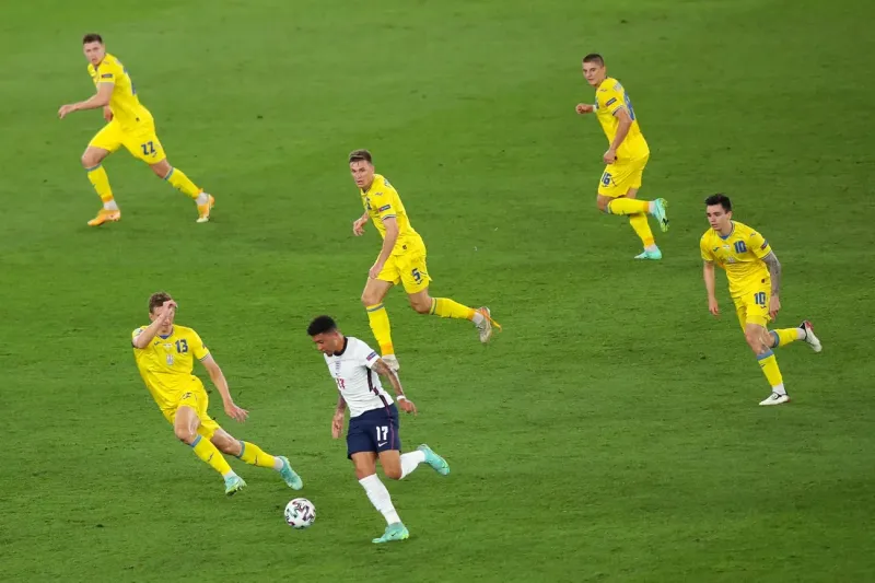 На полупустом стадионе Олимпико в Риме немногочисленные английские болельщики распевают свой гимн Footballʼs coming home. Футболисты сборной Англии начинают педантично уничтожать шансы сборной Украины на победу. Первые четыре минуты они не дают украинцам сделать хотя бы касание. А затем Рахим Стерлинг рывком уходит от Николая Шапаренко на углу штрафной украинцев, делает разрезающую передачу, и капитан англичан Харри Кейн с близкого расстояния протыкает мяч в ворота — мимо вратаря Георгия Бущана. Затем англичане — как обычно на этом чемпионате — превращают игру в тягомотину. Они не играют сами и не дают играть другим (или же украинцы не могут, только обозначая пару «подходов» к штрафной без удара в створ). В атаке англичане продвигают мяч строго по флангам (где потеря не представляет большой опасности), но все же имеют пару опасных моментов, а Украина — ни одного. Второй тайм оборачивается для украинской сборной катастрофой: на первой же минуте после углового (стандарты — козырь скучной Англии) забивает головой центральный защитник Харри Макгуайр. И Кейн тут же забивает еще, завершая контратаку. Четвертый гол — тоже со стандарта — забивает вышедший на замену Джордан Хендерсон. Украина отвечает лишь «подходами» к штрафной, а Англия не отступает от тягучего футбола — и выходит в полуфинал, где 7 июля в Лондоне встретится с Данией. (Отсюда.)