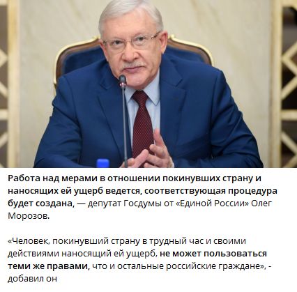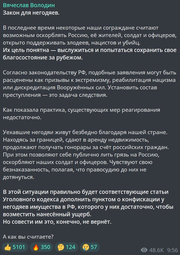 Володин предложил конфисковывать имущество у "негодяев", которые уехали за границу и критикуют войну. Даже если это имущество старый деревянный домик, обогреваемый с помощью печей. А так как уехать любой владелец такого домика может, то и нех их газифицировать.