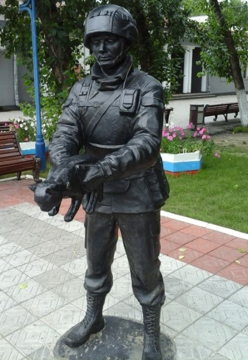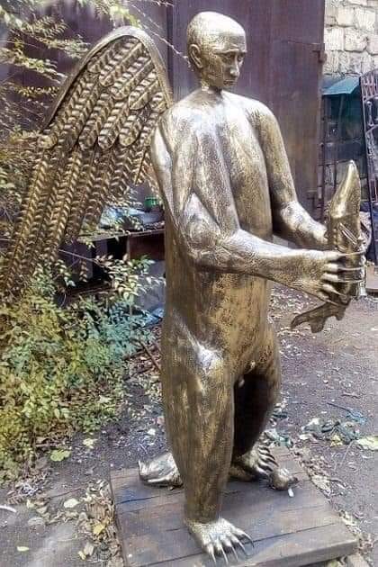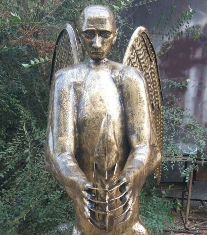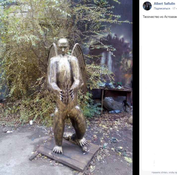Житель Астрахани Виктор Кропачев сделал кованую скульптуру, изображающую Владимира Путина с телом крылатого медведя и осётром в руках. Она называется «Ум, сила и душа».