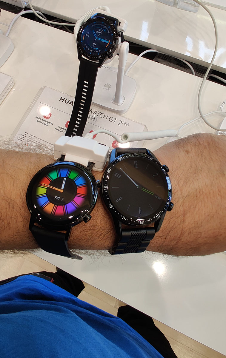 Купил GT 2, но 42 мм. Там нет динамика и микрофона, разговаривать нельзя. Визуально они мне нравились, но как уже написали, циферблаты так се. И вообще, какая-то непродуманность в интерфейсе. Например, управление музыкой — ты его вызываешь, что-то переключил, потом часы гаснут — активируешь — и ты опять на циферблате, надо идти в управление музыкой снова.