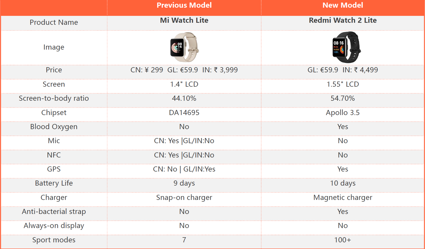 Таблица сравнения с предыдущей моделью: изменения действительно заметные при той же цене для европейского рынка.