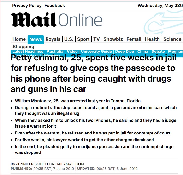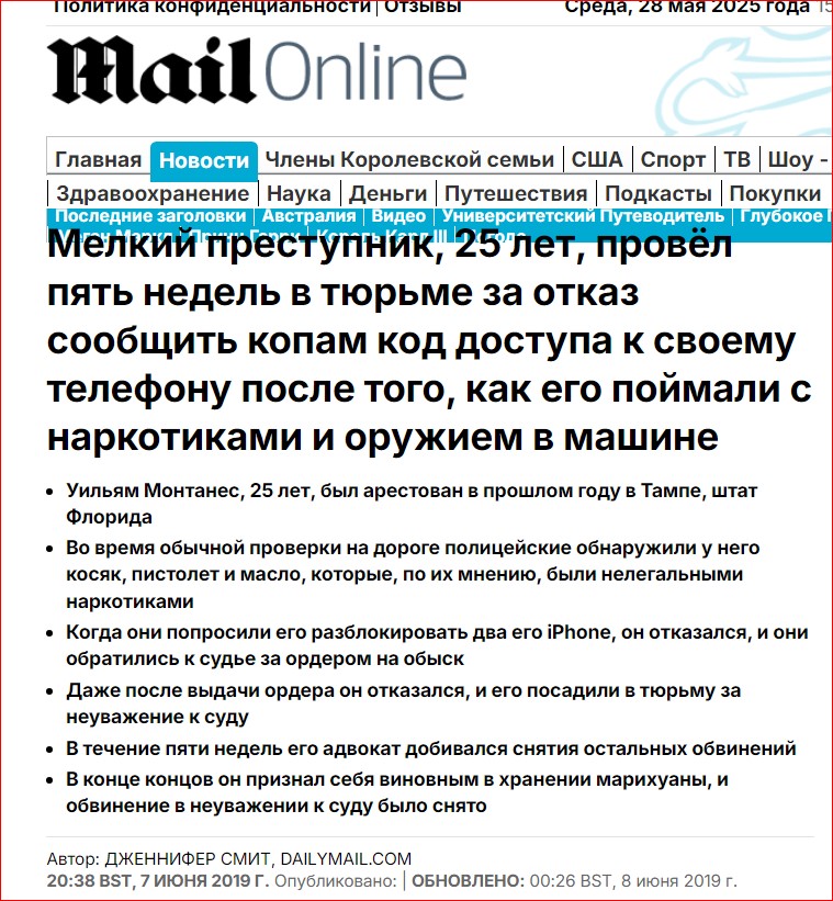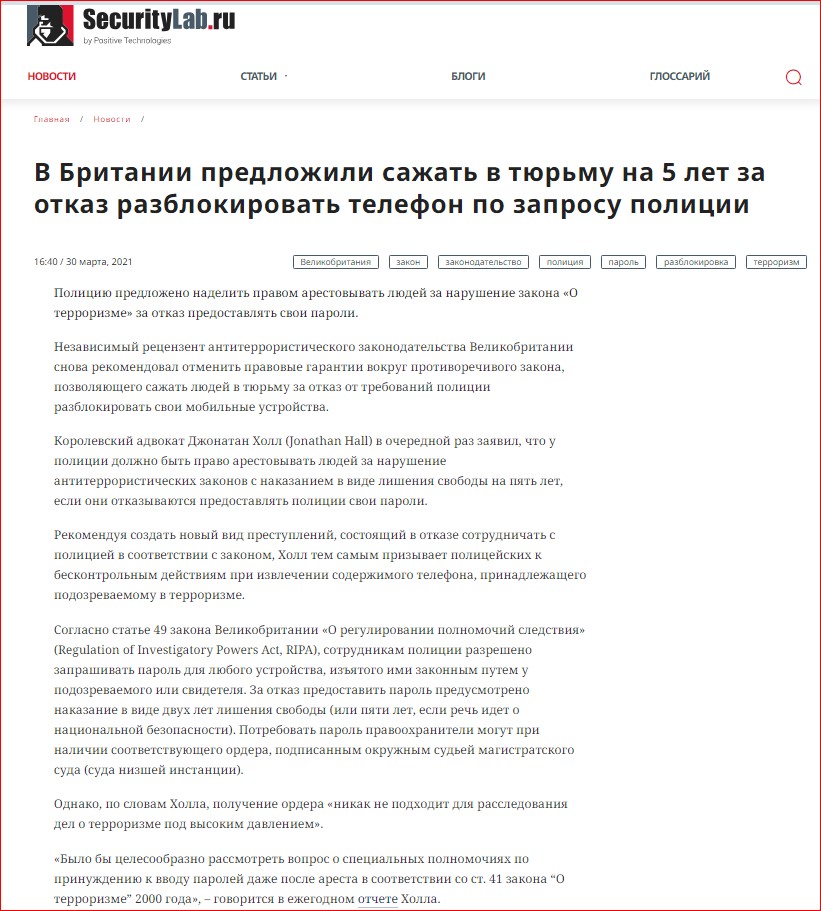 А в Англии пять лет тюрьмы туристу, отказывающемуся от сотрудничества с полицией, например за отказ предоставить разблокированный телефон для анализа любопытному полицейскому