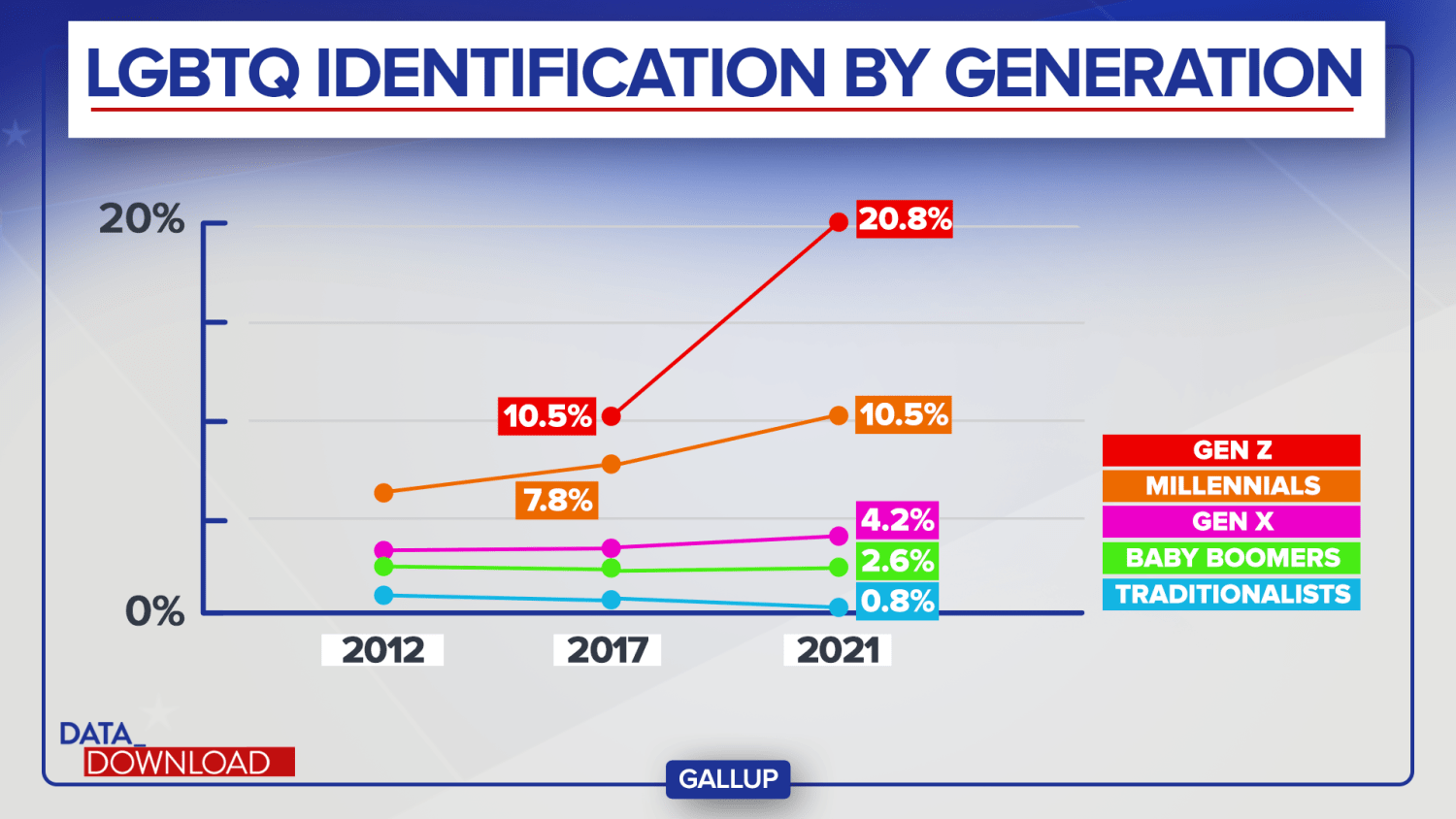 Nearly one-quarter, 23.1%, of Gen Z identify as LGBTQ, according to the Gallup report, compared with 14.2% of millennials, who are 29 to 44; 5.1% of Generation X, who are 45 to 60; 3% of baby boomers, who are 61 to 79; and 1.8% of those 80 and older