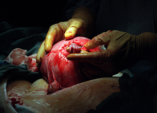 Изначально комитет принял решение о внутриутробном ведении, при этом акушеры выполняли методы, направленные на уменьшение компрессии опухоли, чтобы позволить ребенку достичь 28-й недели беременности и избежать преждевременных родов. На 28-й неделе беременности, то есть на шестом с половиной месяце, и учитывая "экстремальную" тяжесть, было решено извлечь ребенка путем кесарева сечения, при этом его вес составлял всего 900 граммов.