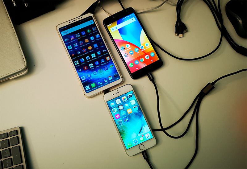 Гоняю похожие проводки уже больше года. Очень удобны наличием трех самых популярных разъемов, и заряжают одно устройство достаточно шустро. При подключении двух надо смотреть, может ли поступающий ток обеспечить достаточный ампераж. Еще есть глюки с отдельными Apple устройствами: в частности, iPad не заряжается, если проводок не включен в стандартную яблочную вилку. У меня дома целый зоопарк устройств, так что за год много разных вариантов пришлось попробовать. Пару андроидов на USB-C и на microUSB - не вопрос! Как только яблочный девайс на Lightning разъем вешаешь - как получится, может и не зарядить.