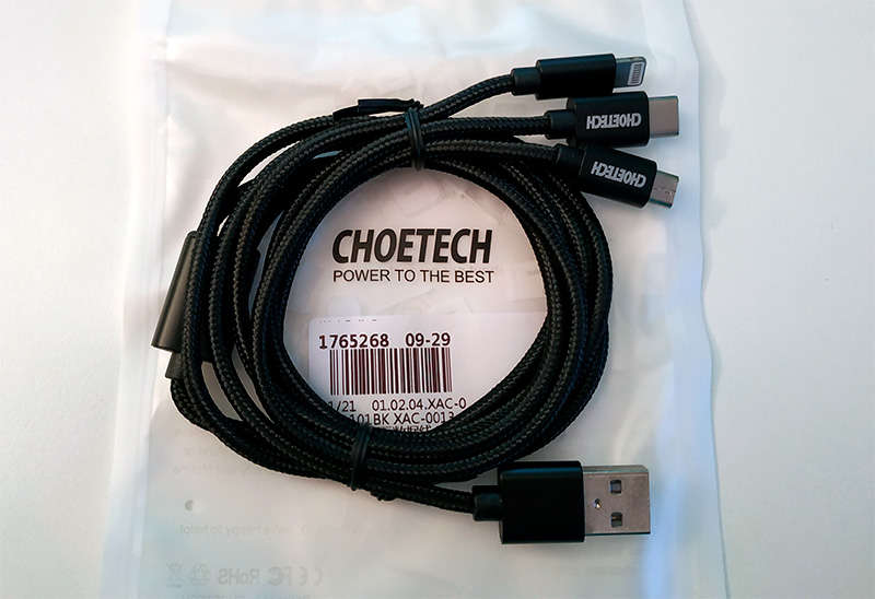 Приехали вот эти универсальные проводочки "три в одном". Я раньше использовал универсальный вариант с двумя переходниками (основная - microUSB и есть насадки на Type-C и Lightning), но этот вариант - намного удобнее, потому что, во-первых, не надо возиться с насадками, а, во-вторых, можно одновременно подключать хоть три устройства к одному порту.
