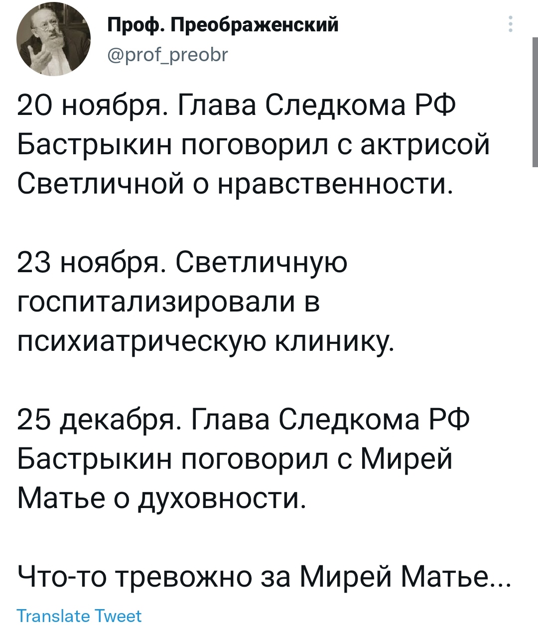 Ну тут одно из двух -- либо гражданка Матье в ближайшее время переедет на пмж в Саранск, либо угодит в иностранные агенты. Кстати, Бастрыкин последнее время что то прямо таки попер по духовной бодяге, этак скоро и Гундяев забеспокоится в плане конкуренции.