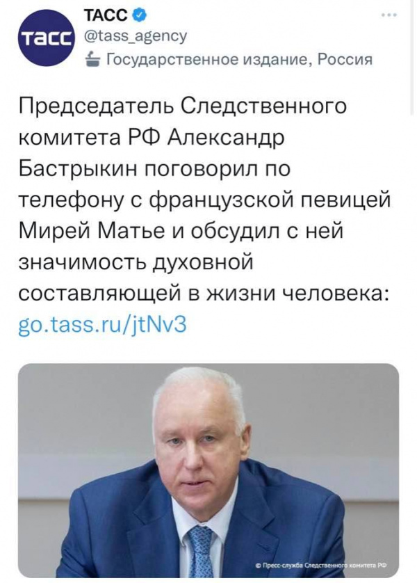 Учитывая что ТАСС это все таки агенство которое получает инфу из официальных государственных источников, получается что Бастрыкин просто решил выпендрится своим звонком к этой мадам и для этой цели информировал ТАСС. Но там оказались ребята слишком трудоспособные в своем деле и переборщили с пропагандой... Ну это тоже версия.
