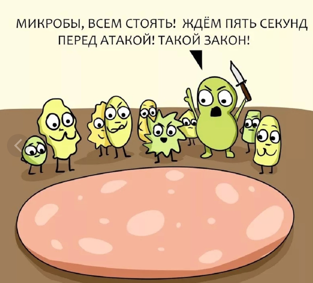 Вообще-то это глупости. Как сторонники 5-секундной безопасности это себе представляют? Микробы, рядом с которыми свалился кусок, бегут к нему, чтобы успеть забраться?