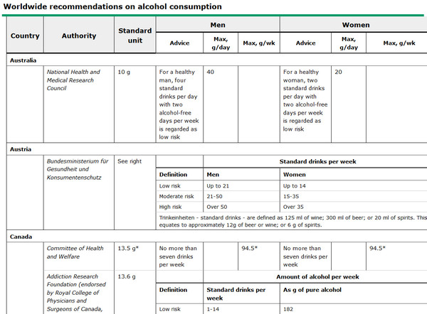 Вообще-то, судя по табличке это не рекомендованные, а малооопасные (low risk) дозы. Так что, Алекс, может поправите в тексте в начале "рекомендованное" на "малоопасное", чтоб не казалось, что вы рекламируете потребление алкоголя?