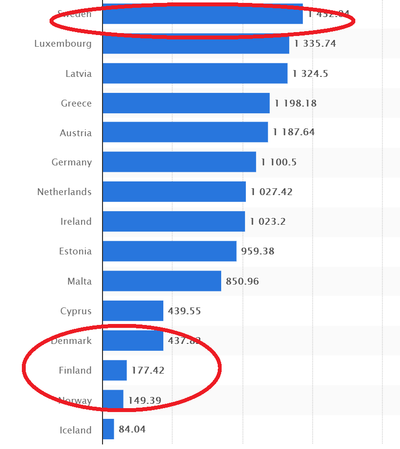 А привести данные статистики стран-соседей не судьба? Ну чтобы сравнивать яблоки с яблоками, и Швецию с ее соседями-скандинавскими странами, а не с Румынией и Италией?