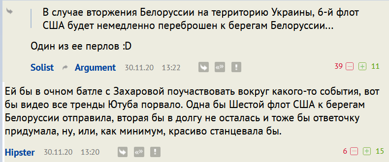 Ей бы в очном батле с Захаровой поучаствовать вокруг какого-то события, вот бы видео все тренды Ютуба порвало. Одна бы Шестой флот США к берегам Белоруссии отправила, вторая бы в долгу не осталась и тоже бы ответочку придумала, ну, или, как минимум, красиво станцевала бы.