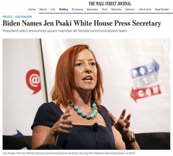 Избранный президент США Джо Байден объявил, что решил назначить 41-летнюю Дженнифер Псаки пресс-секретарем своей администрации. Об этом сообщается на сайте переходного периода, созданного командой Байдена. (Отсюда.)