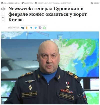 По пабликам тут начал гулять вот такой скриншот (см. выше) статейки из "МК", с Суровикиным, который вот прям в феврале может оказаться у ворот (почему не "врат"?) Киева. Я сначала подумал, что его в плен возьмут - пошел читать. Но там всего-навсего пересказывают одну очень смешную статейку из Newsweek - вот ее изложение по-русски в Иносми - зацените заголовок "Уроки гражданской войны в США показывают, почему Украина не может победить".
