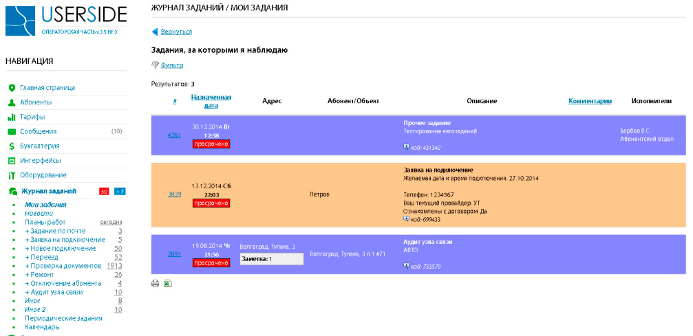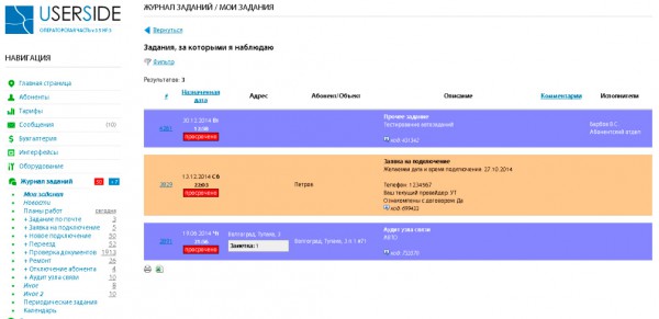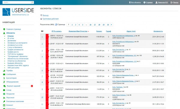 Ведется подробная база абонентов с очень гибкими возможностями фильтрации и отбора. У каждого абонента есть свой личный кабинет.